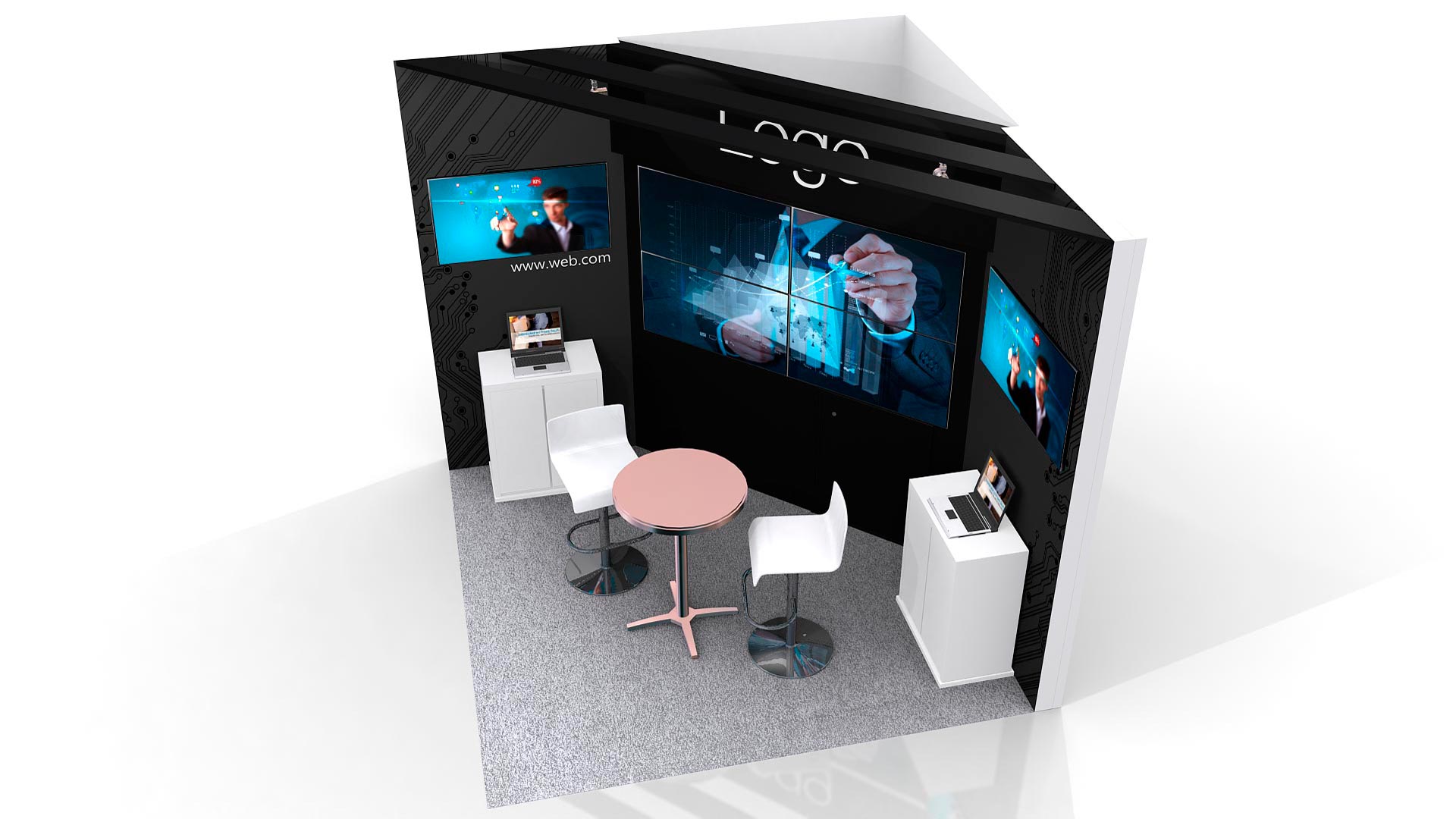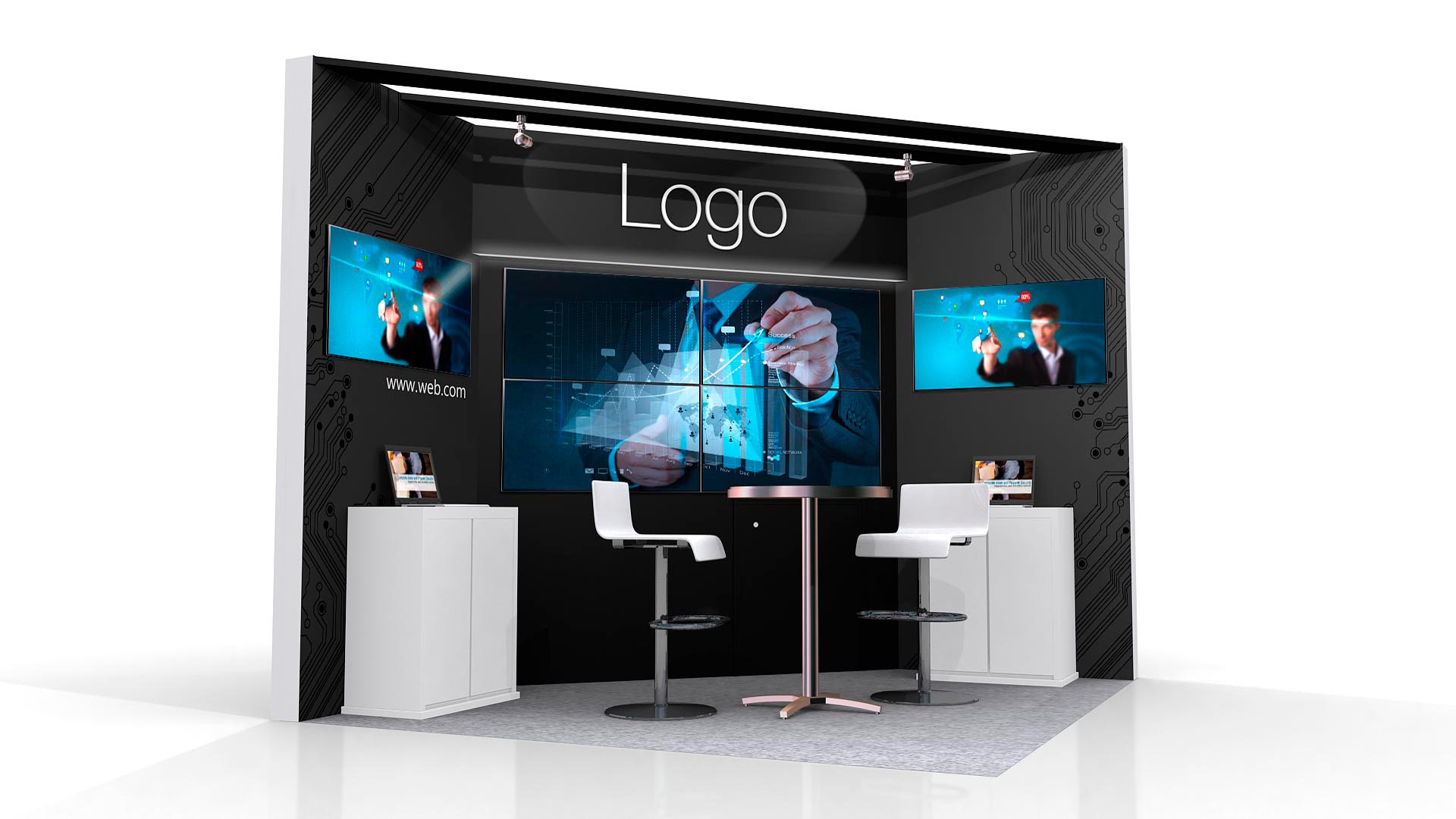 El área del stand se puede aumentar o reducir para ajustar a medidas (Aplican restricciones). El mobiliario, accesorios, gráficos, colores, pisos y acabados son opcionales y/o modificables.