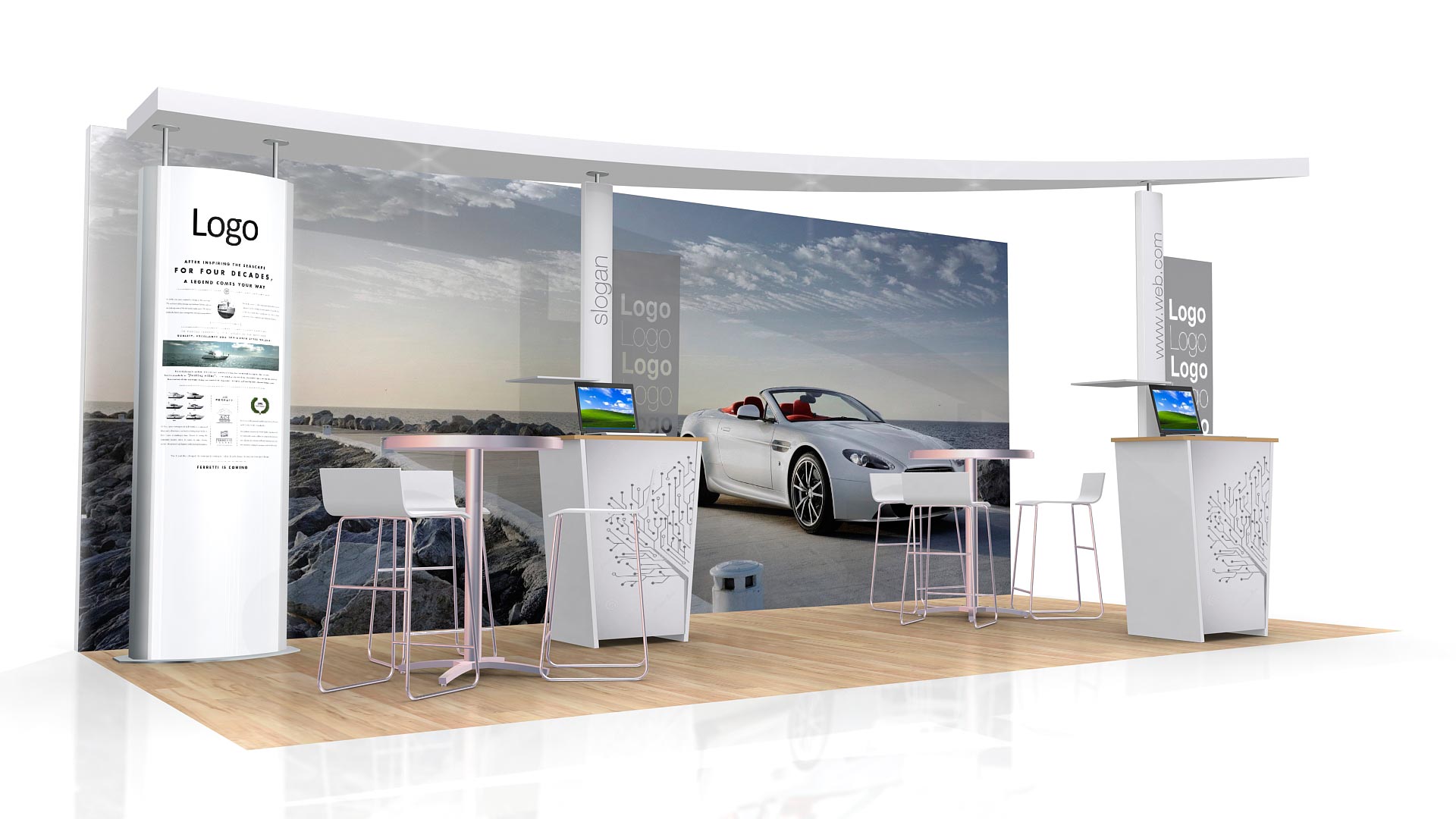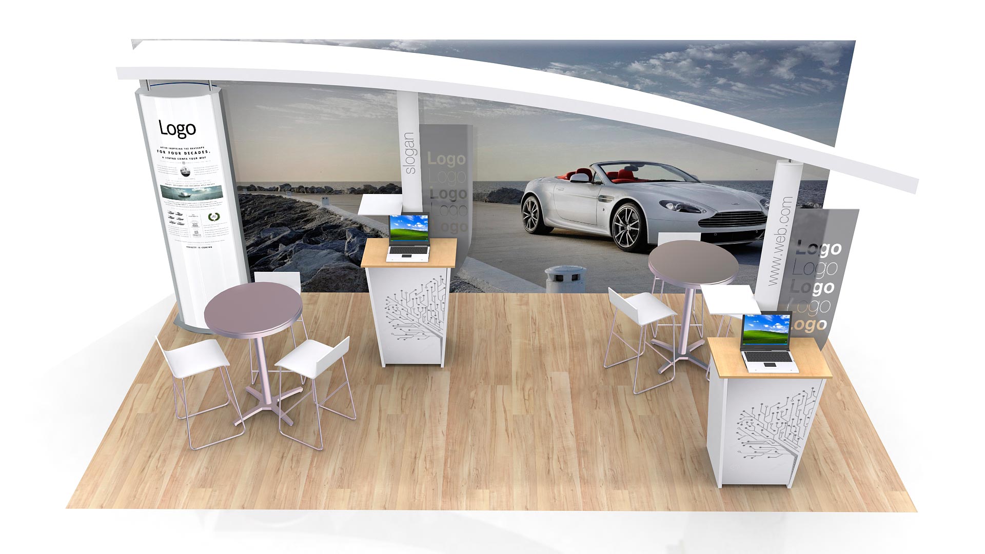 El área del stand se puede aumentar o reducir para ajustar a medidas (Aplican restricciones). El mobiliario, accesorios, gráficos, colores, pisos y acabados son opcionales y/o modificables.