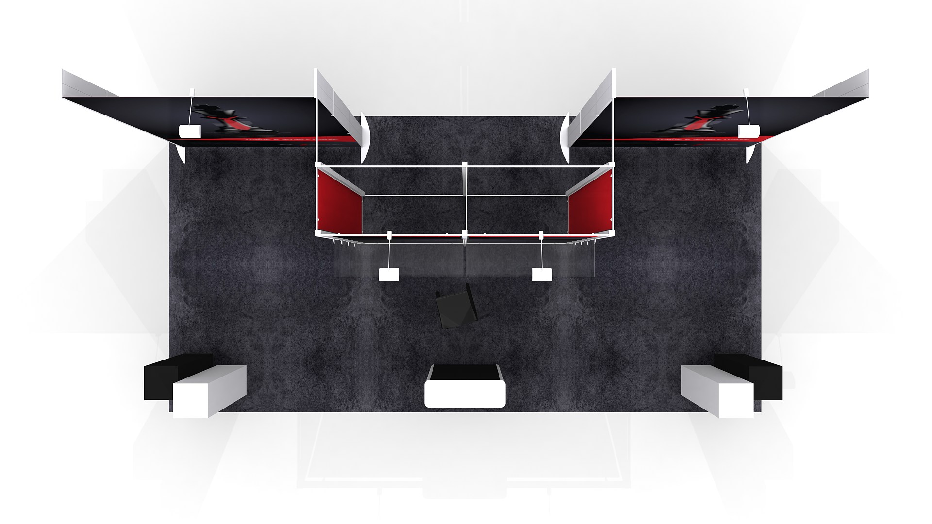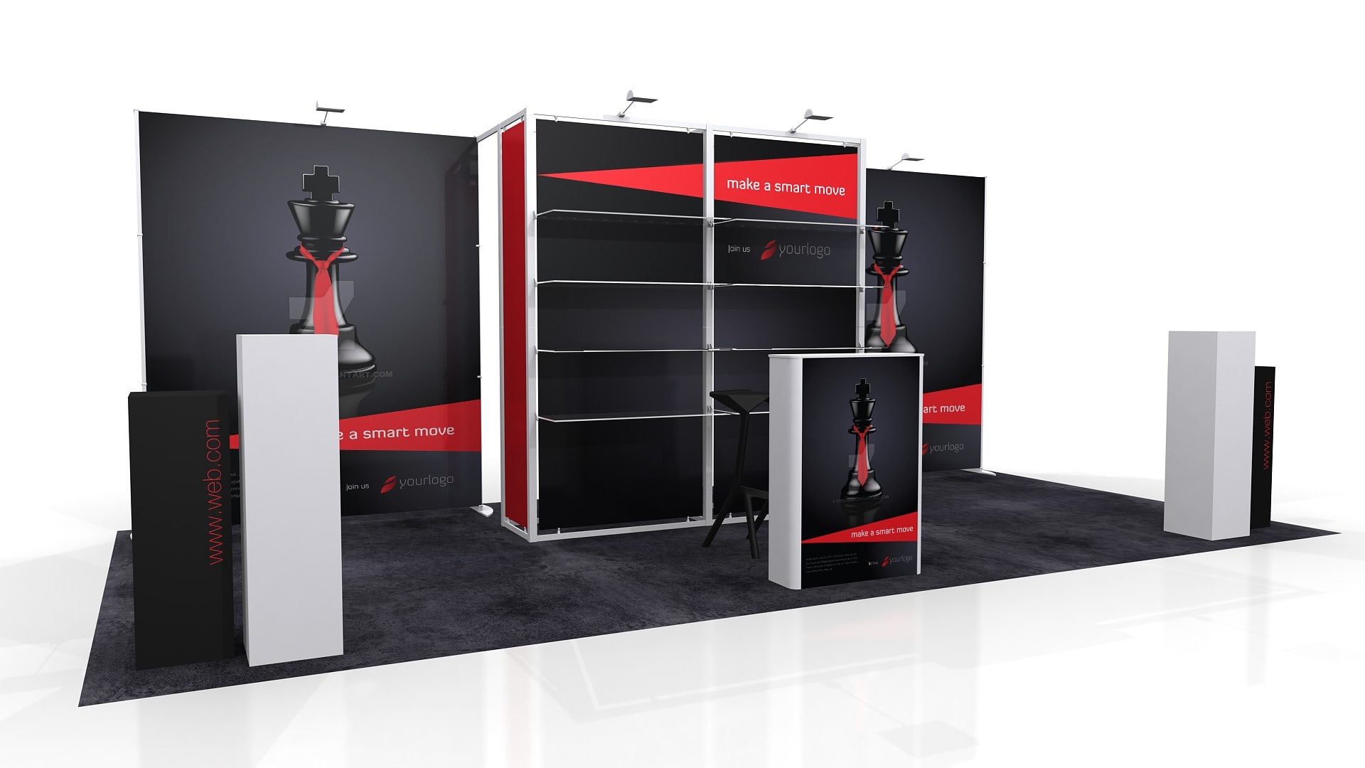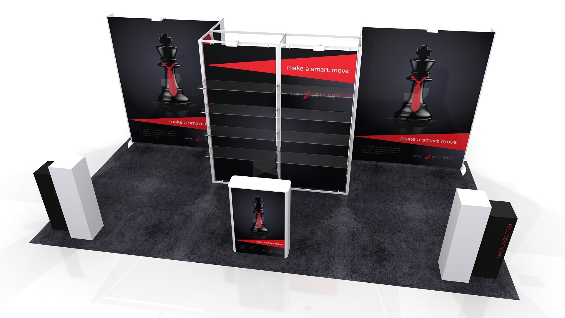 El área del stand se puede aumentar o reducir para ajustar a medidas (Aplican restricciones). El mobiliario, accesorios, gráficos, colores, pisos y acabados son opcionales y/o modificables.