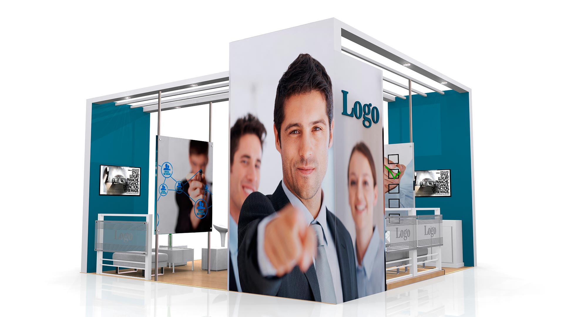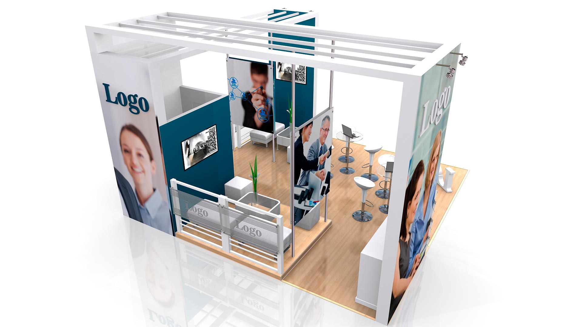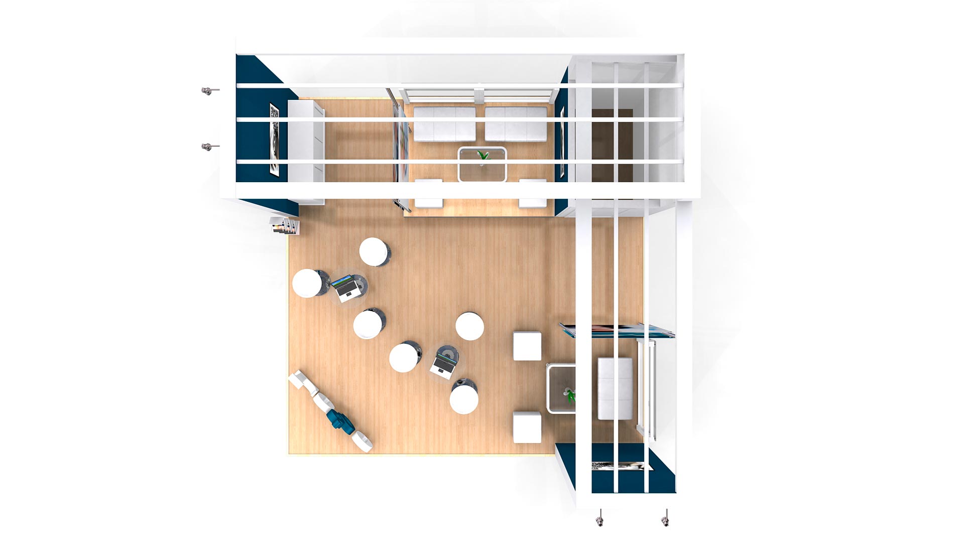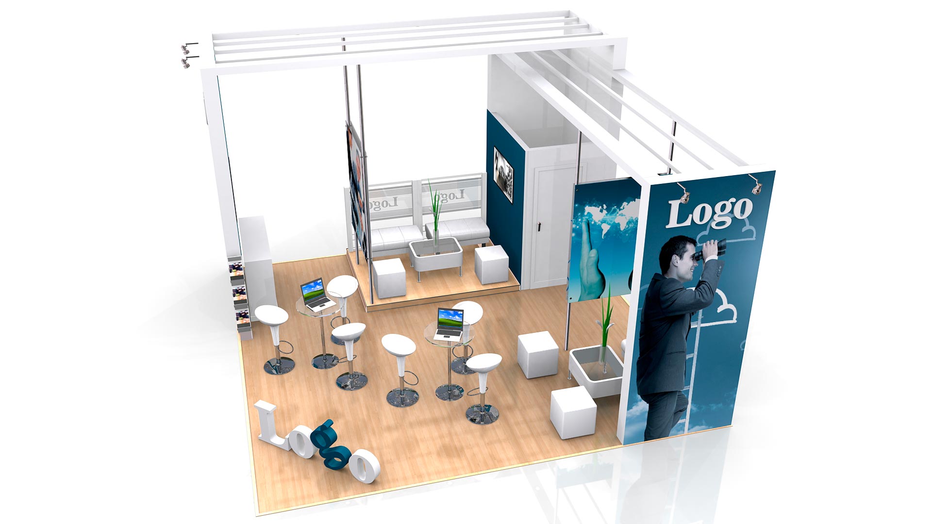 El área del stand se puede aumentar o reducir para ajustar a medidas (Aplican restricciones).  El mobiliario, accesorios, gráficos, colores, pisos y acabados son opcionales y/o modificables.