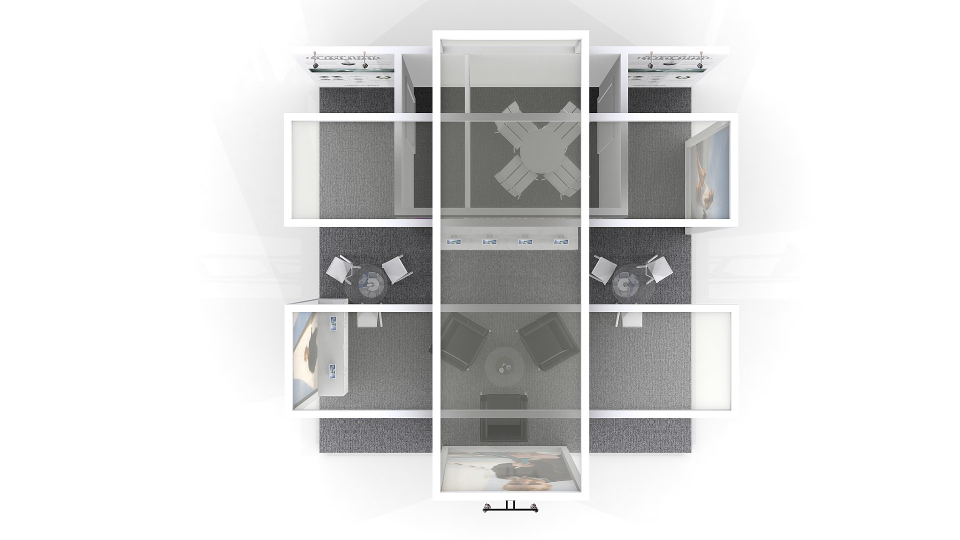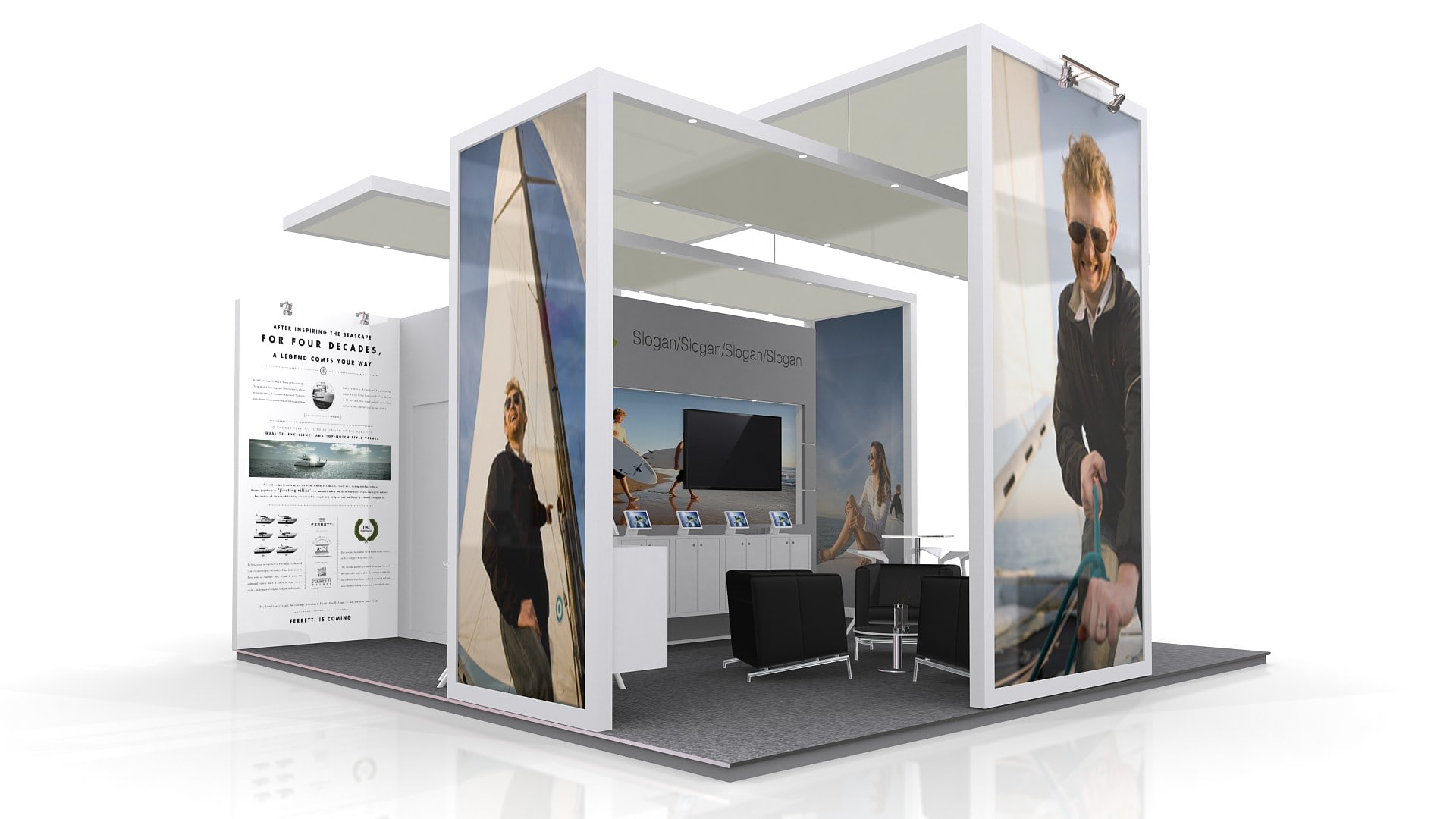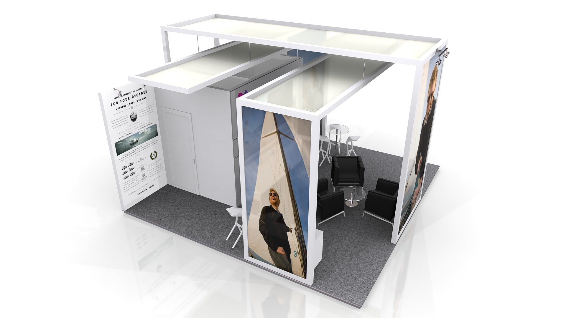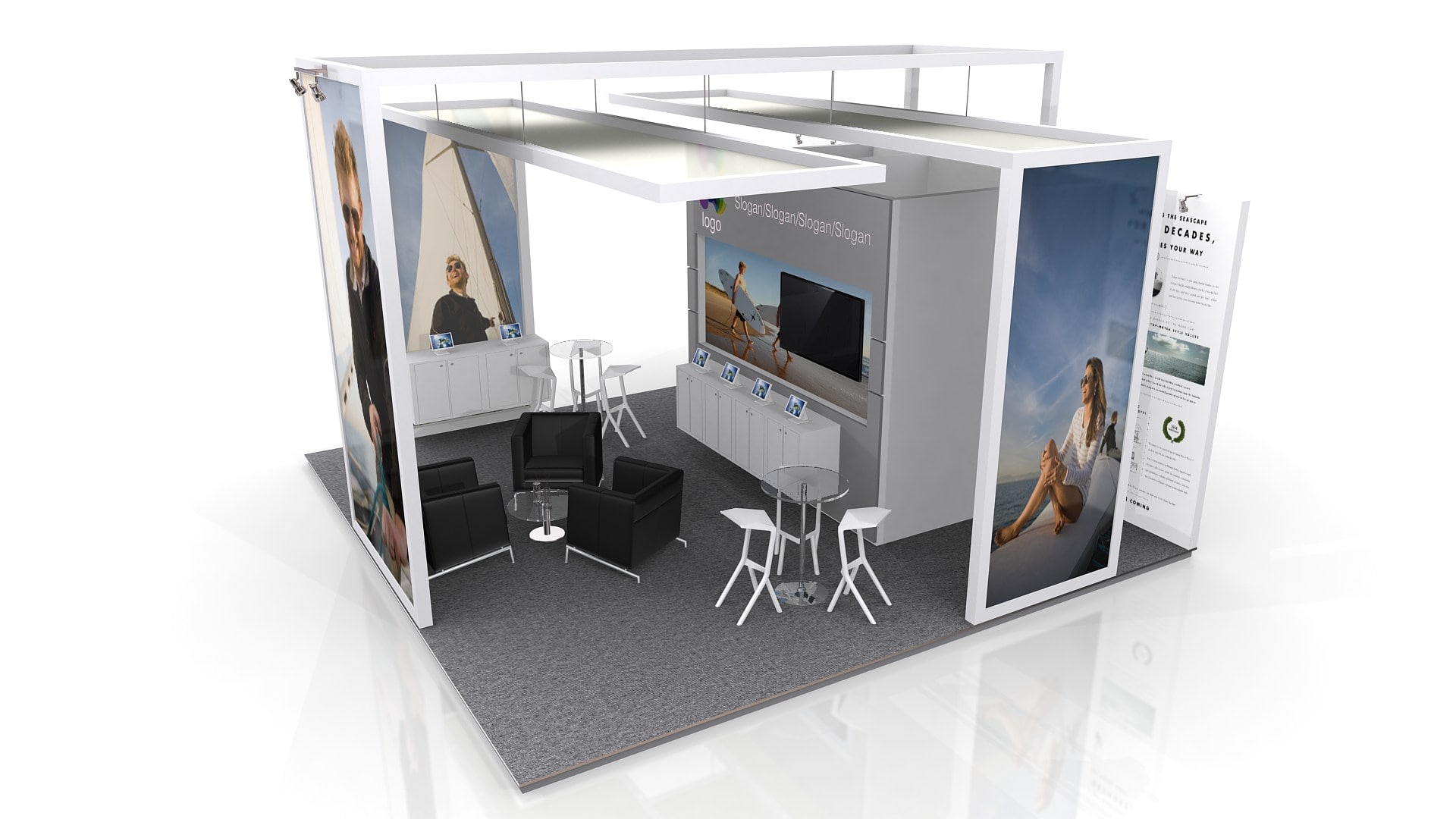 El área del stand se puede aumentar o reducir para ajustar a medidas (Aplican restricciones).  El mobiliario, accesorios, gráficos, colores, pisos y acabados son opcionales y/o modificables.