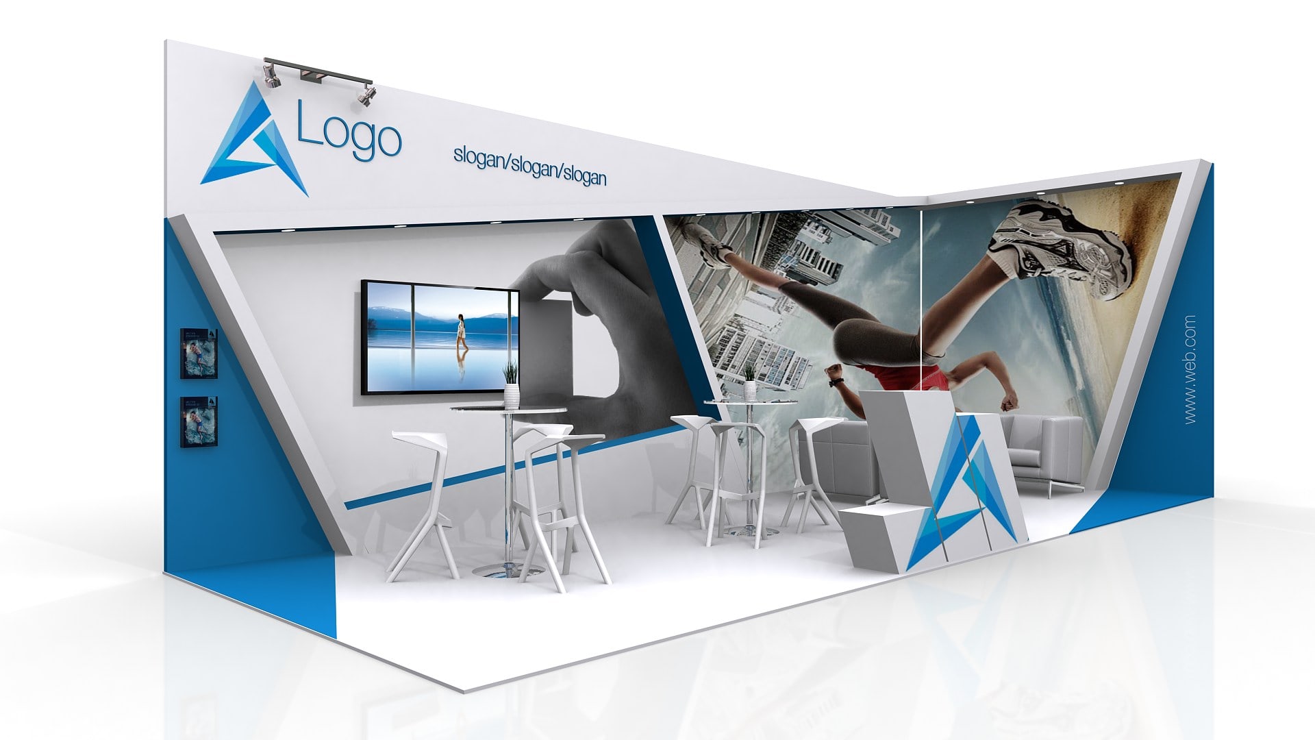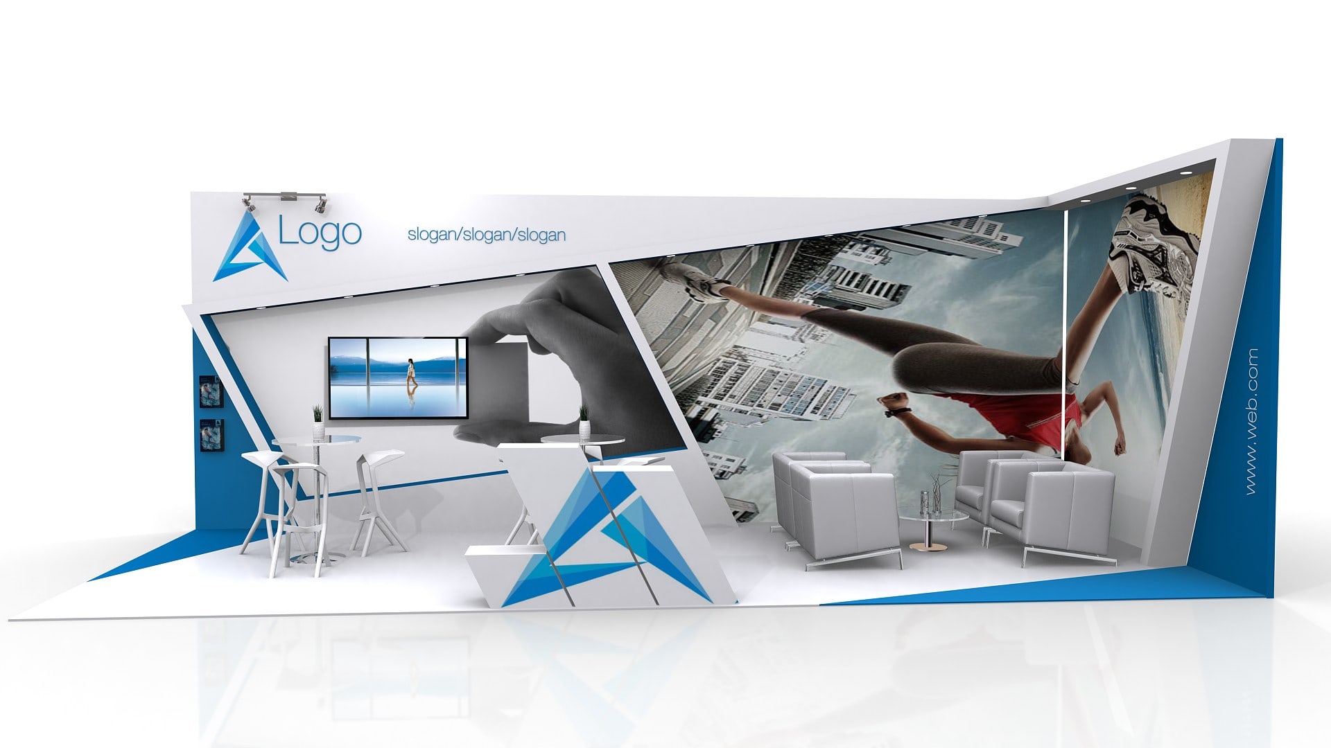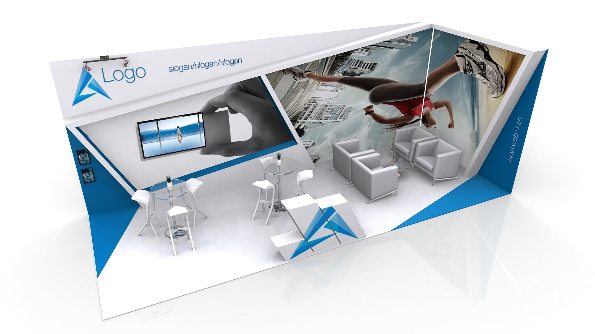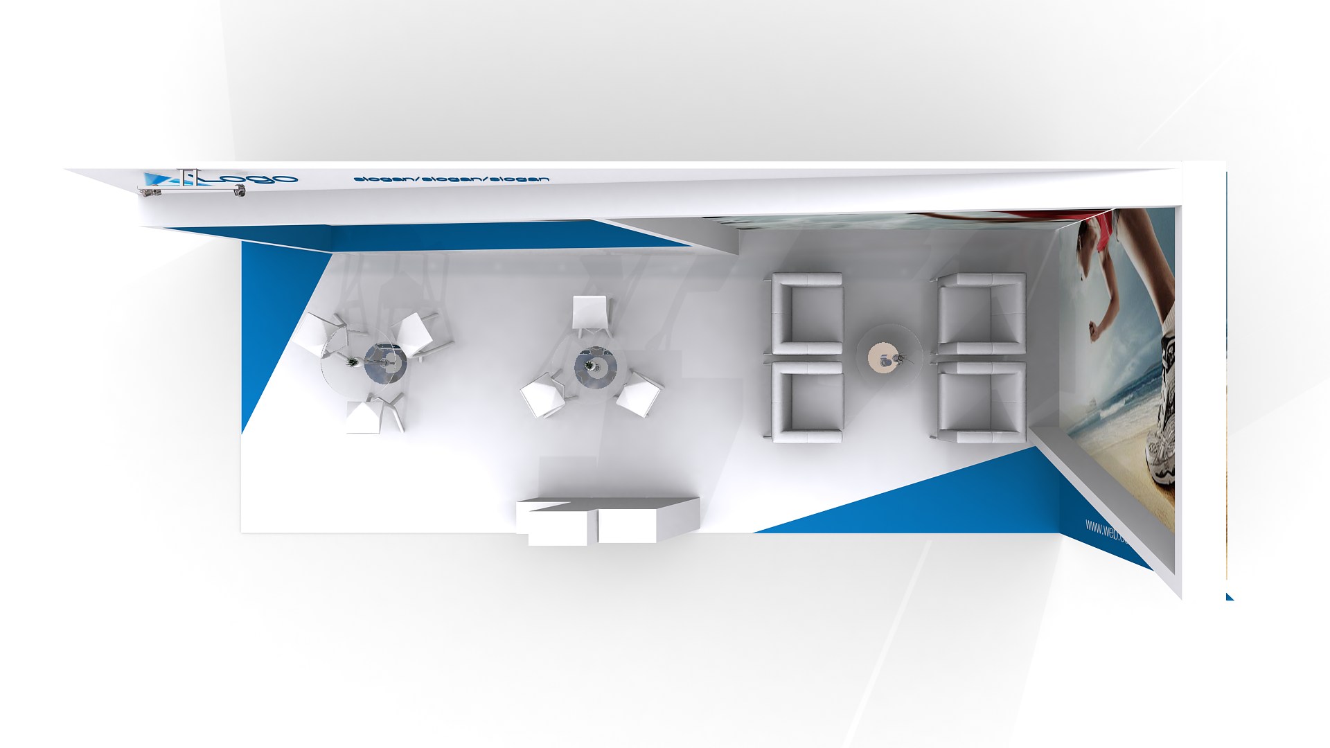 El área del stand se puede aumentar o reducir para ajustar a medidas (Aplican restricciones).  El mobiliario, accesorios, gráficos, colores, pisos y acabados son opcionales y/o modificables.