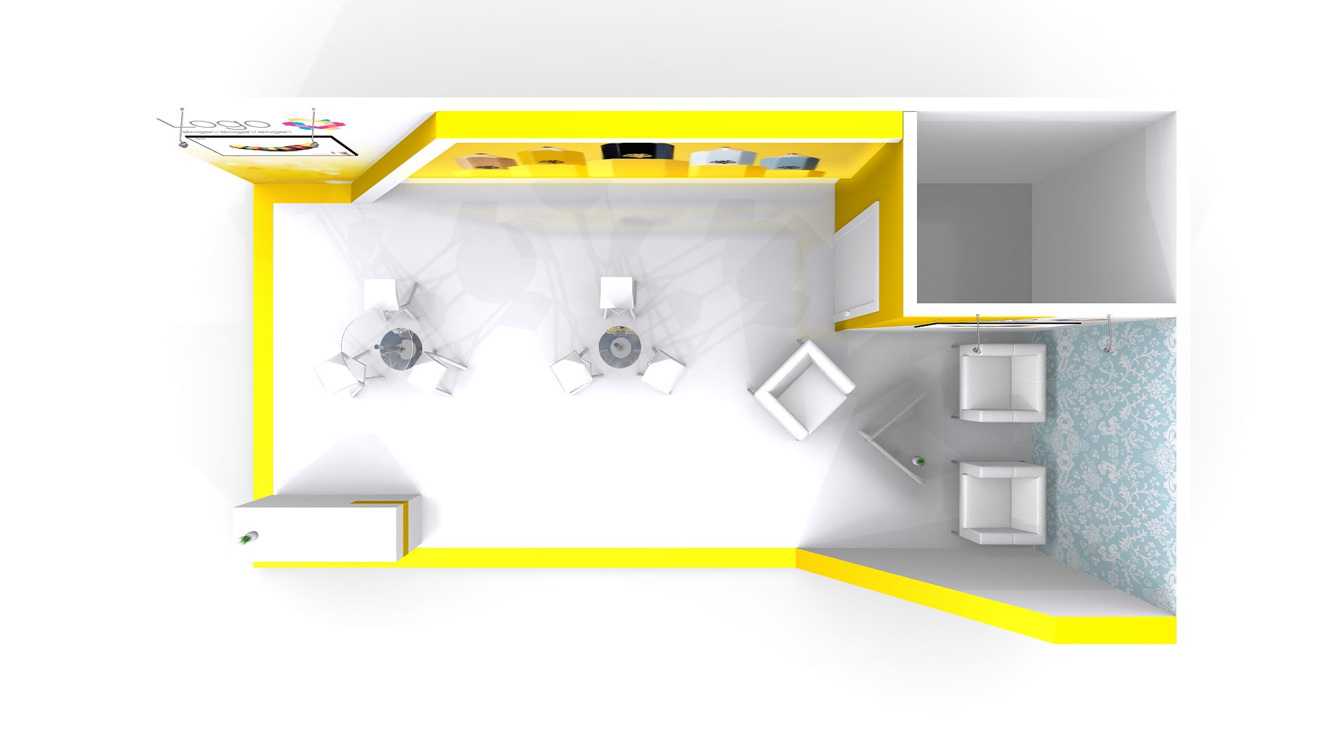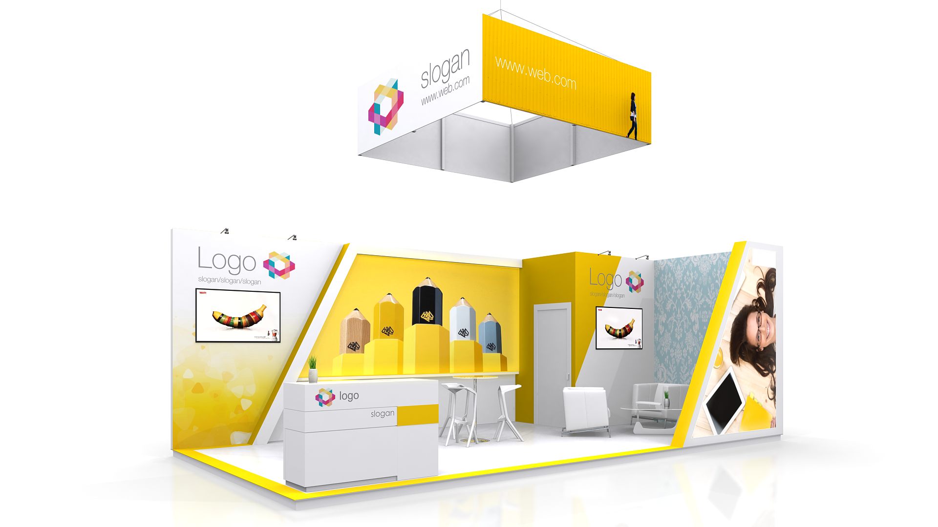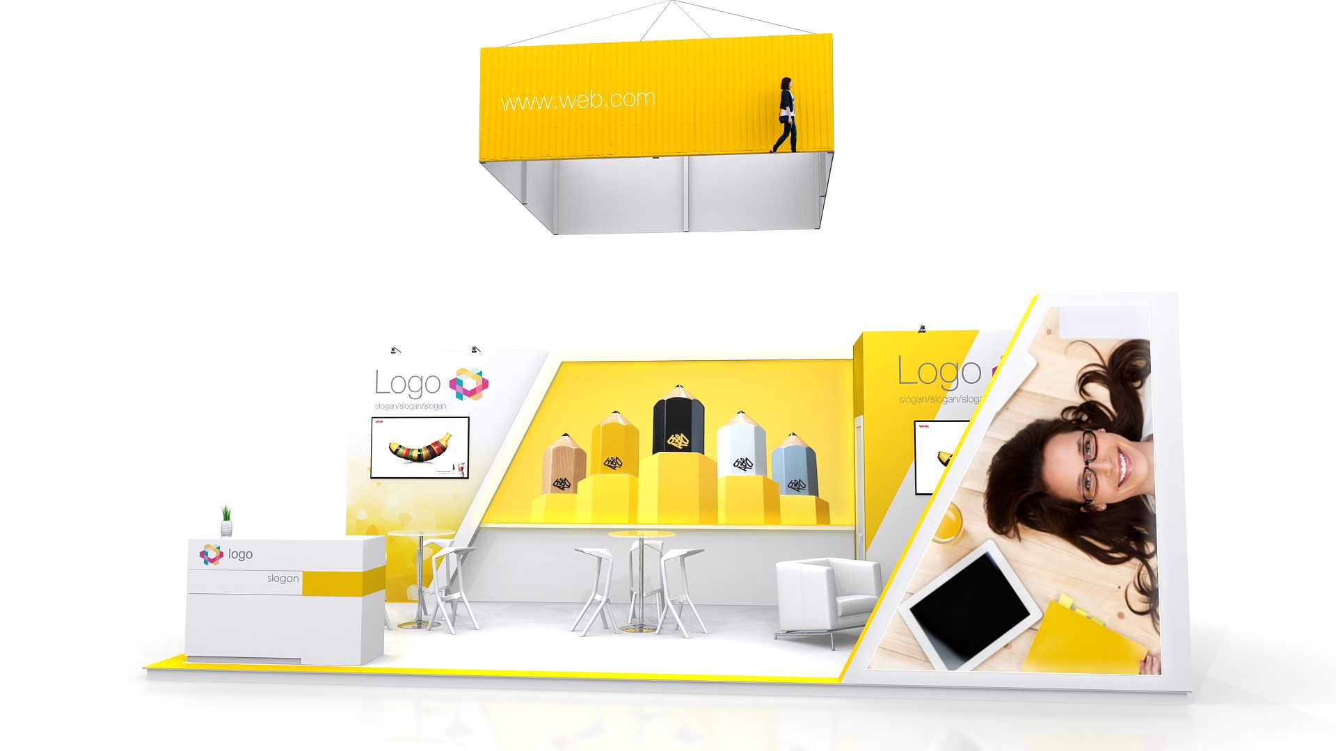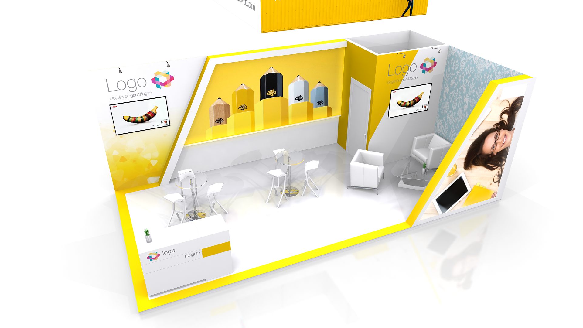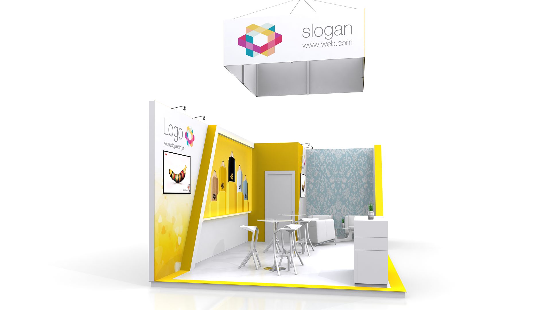 El área del stand se puede aumentar o reducir para ajustar a medidas (Aplican restricciones). El mobiliario, accesorios, gráficos, colores, pisos y acabados son opcionales y/o modificables.