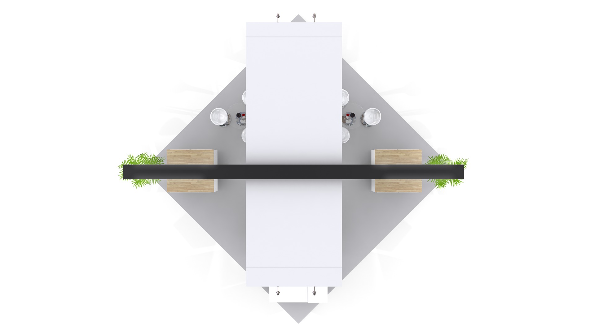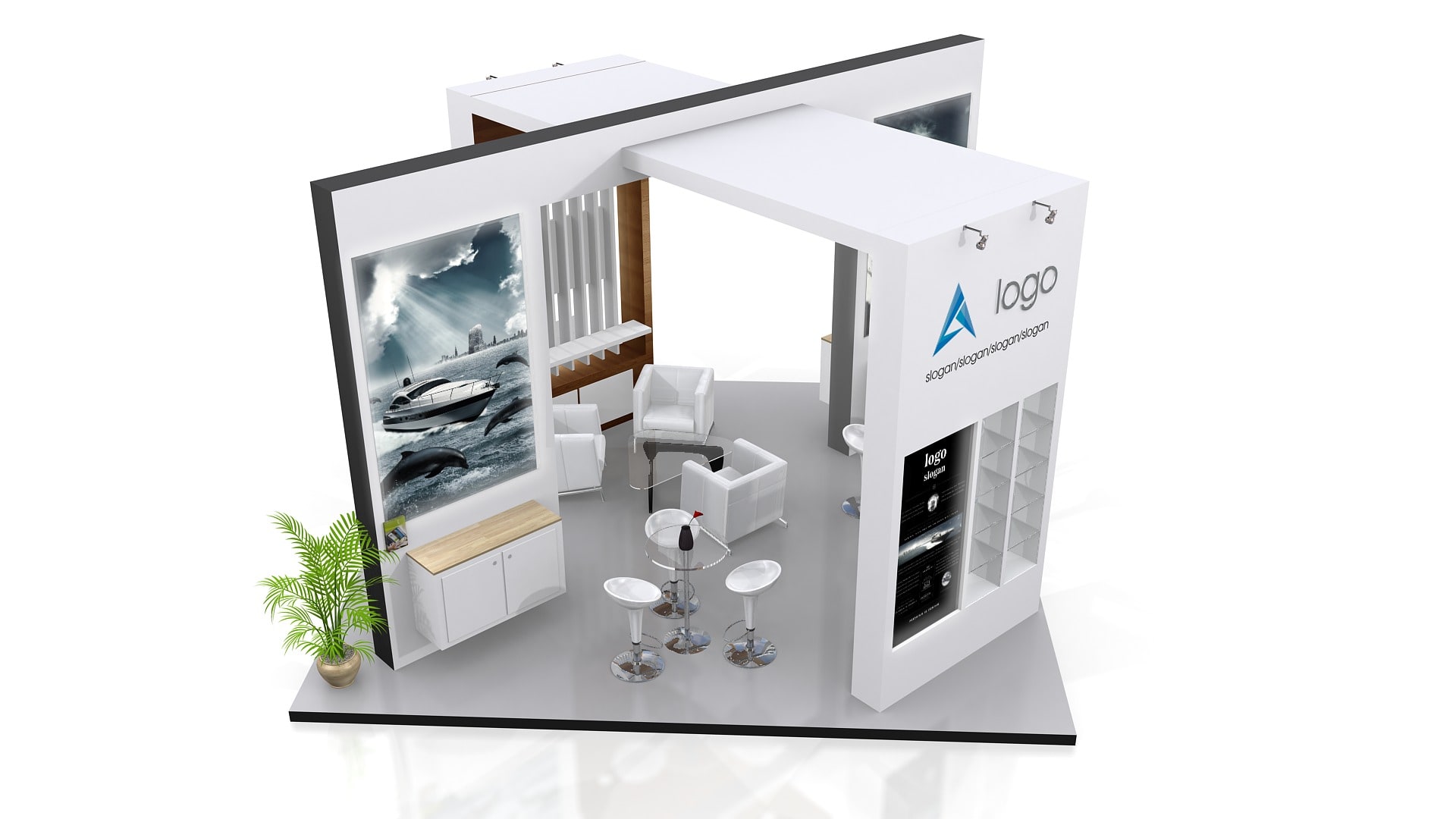 El área del stand se puede aumentar o reducir para ajustar a medidas (Aplican restricciones).  El mobiliario, accesorios, gráficos, colores, pisos y acabados son opcionales y/o modificables.