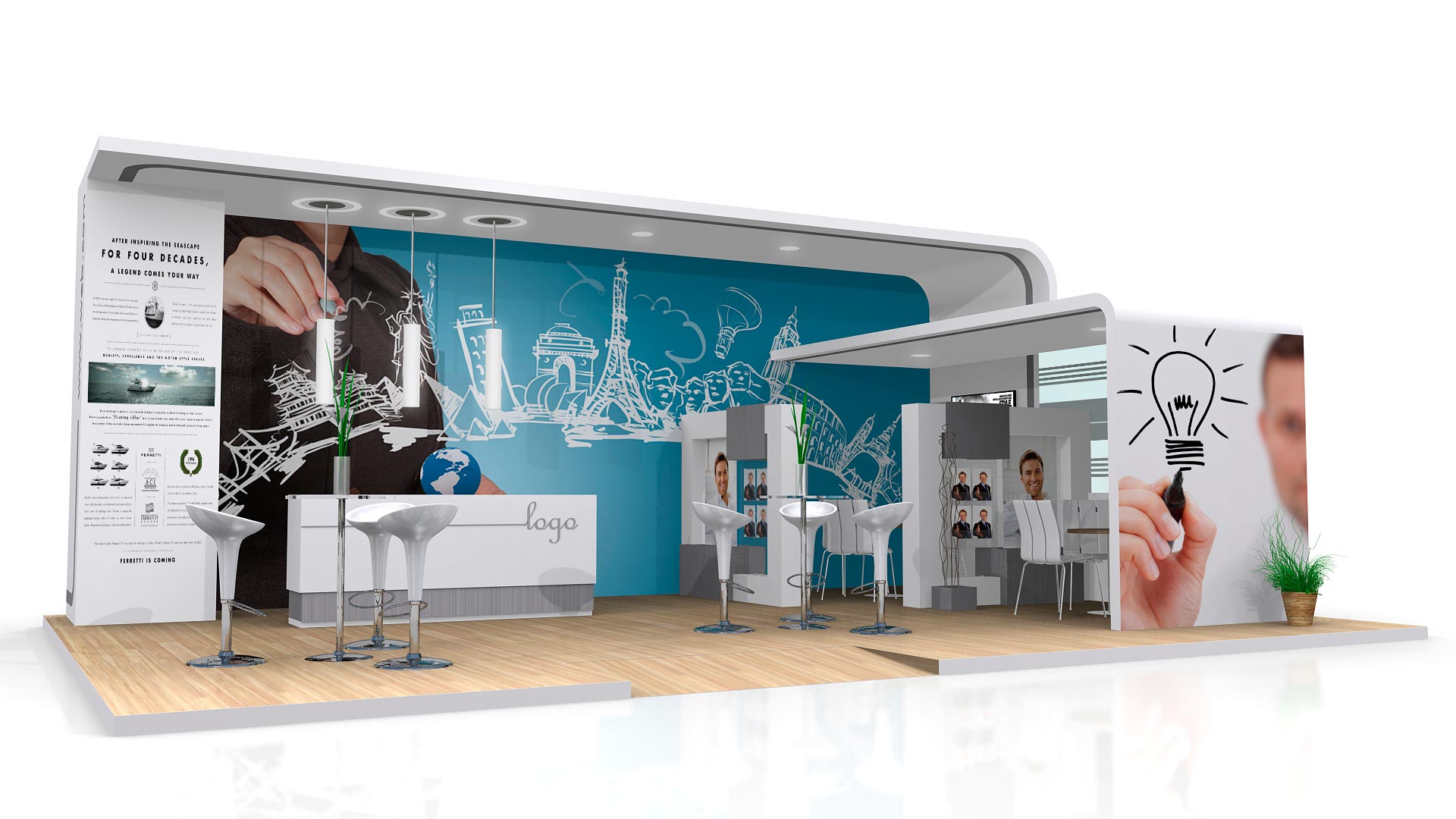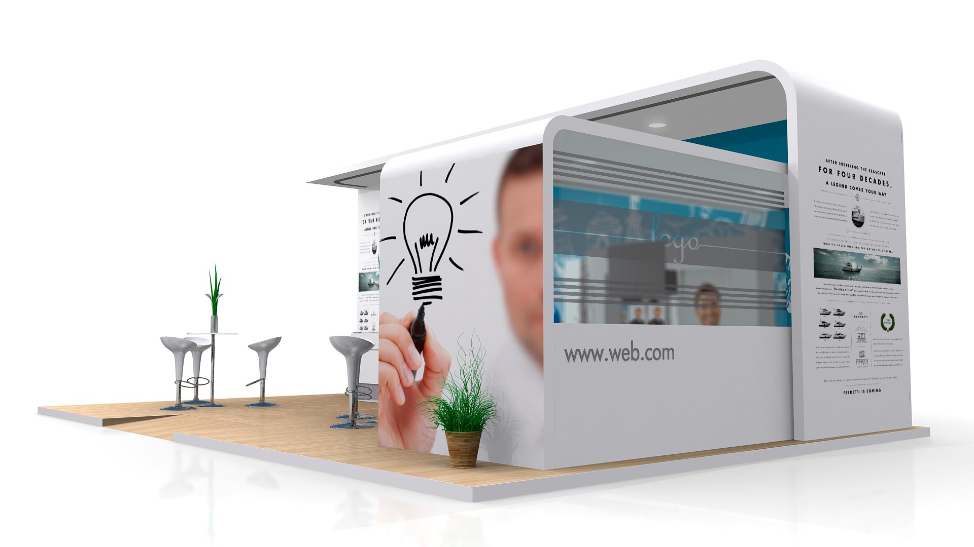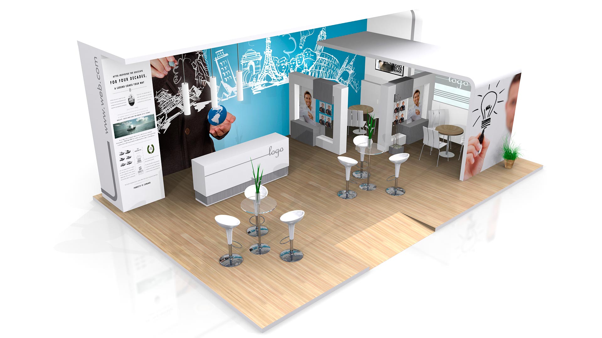 El área del stand se puede aumentar o reducir para ajustar a medidas (Aplican restricciones). El mobiliario, accesorios, gráficos, colores, pisos y acabados son opcionales y/o modificables.