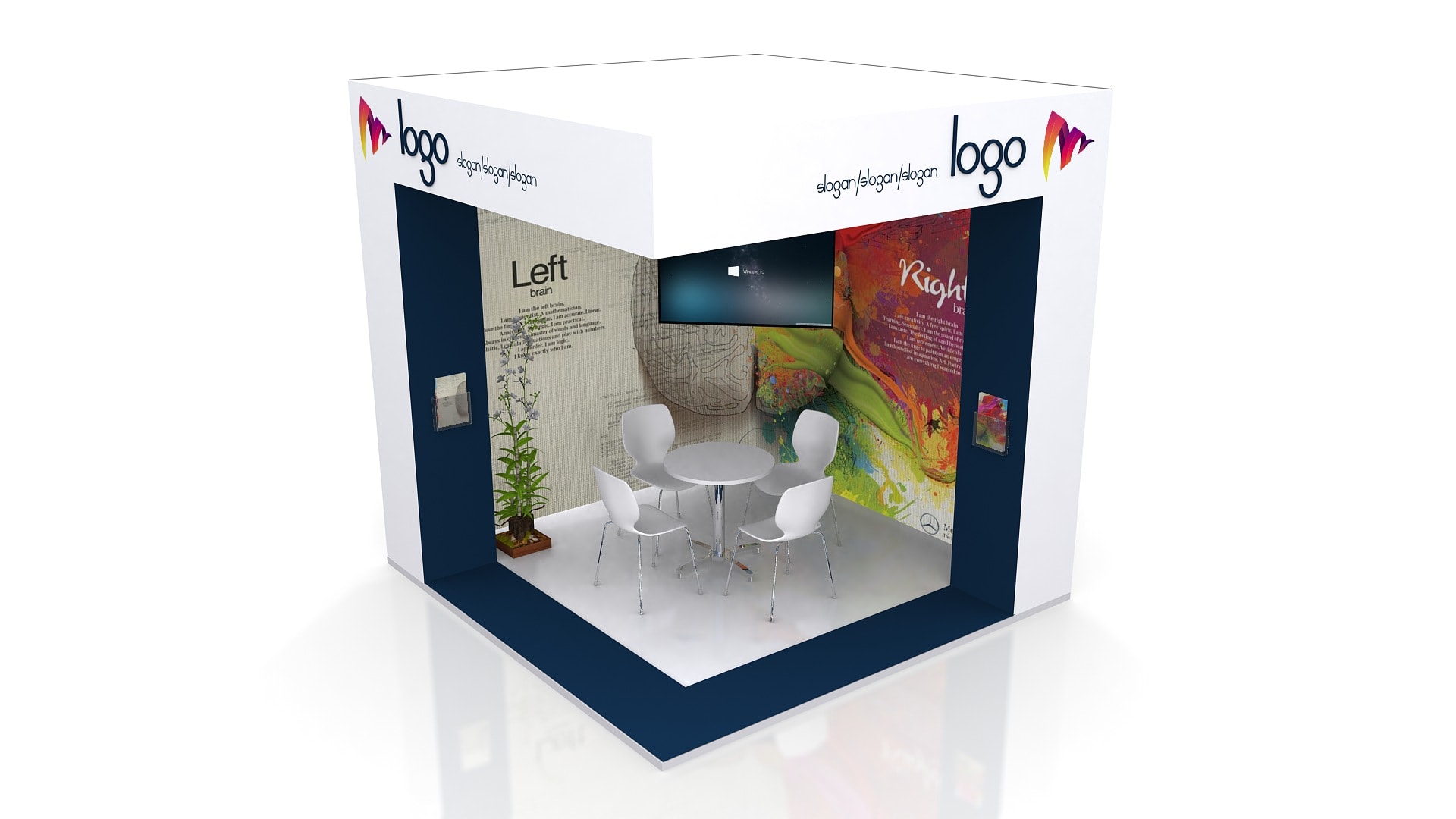 The stand area can be increased or decreased to adjust measures. The furniture, accesories, graphics, colors, flooring and finishes are optional and/or modifiable.